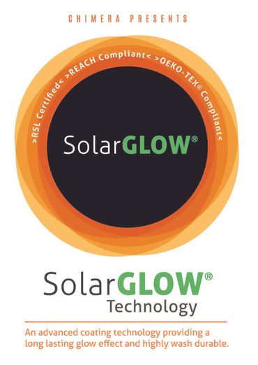 SolarGLOW® resolves these problems by providing excellent pH level stability, eliminating dye migration concerns, extraordinary softness, highly wash durable, and long lasting glow in the dark performance even after washed.